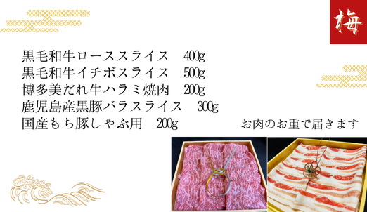 商品詳細 HOME 商品一覧 【送料無料】肉の福袋 ~梅コース~ 【送料無料】肉の福袋 ~梅コース~ お肉を熟知した職人が、一枚一枚丁寧にスライス致しました 数量: ¥15,000円(税込み) ご自宅用にも贈答用にも嬉しい「九州産の黒毛和牛」のセットです。 ▷黒毛和牛ロース・イチボスライス・牛ハラミ焼肉・黒豚バラスライス・もち豚しゃぶ用 ▼商品説明 こちらの松コースは、厳選された九州産の上質な牛肉を使用しており、柔らかさと風味が際立つ逸品です。肉質はとろけるような食感で、旨味がたっぷりと詰まっています。焼き肉やしゃぶしゃぶ、すき焼きなど、様々な料理に最適で、家庭での特別なひとときを演出します。 使いやすい薄切りタイプで、調理は簡単。忙しい日の夕食にもぴったりです。 おすすめの調理法▼ 焼き肉:グリルで焼き上げ、特製のタレで味わえば、まるで高級焼肉店のような味わいに。 しゃぶしゃぶ:熱々のお出汁にさっとくぐらせ、色とりどりの野菜と一緒にお楽しみください。 すき焼き:甘辛いタレとともに煮込むことで、肉の旨味がしっかりと染み込んだ絶品料理が完成します。 大切な人との特別な食事や、自分へのご褒美に、ぜひ当社の牛ローススライスをお試しください。美味しさと満足感をお届けします! 【送料無料】肉の福袋 ~梅コース~ 【名称】黒毛和牛 【原材料】和牛(国産) 【内容量】 黒毛和牛ローススライス 400g 黒毛和牛イチボスライス 500g 博多美だれ牛ハラミ焼肉 200g 鹿児島産黒豚バラスライス 300g 国産もち豚しゃぶ用 200g 【お届け状態】冷凍 【保存方法】到着後すぐ冷凍庫にて保管をお願いします。 【賞味期限】冷凍状態でお届け日より約2か月