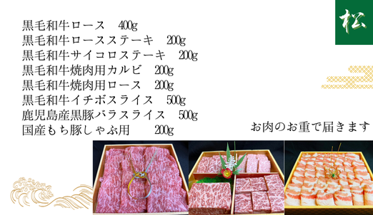 商品詳細 HOME 商品一覧 【送料無料】肉の福袋~松コース~ 【送料無料】肉の福袋~松コース~ お肉を熟知した職人が、最後に舌を唸らせた 数量: ¥25,000円(税込み) ご自宅用にも贈答用にも嬉しい「九州産の黒毛和牛」と「鹿児島県産黒豚しゃぶしゃぶ」のセットです。 ▷黒毛和牛ロース、ロースステーキ、サイコロステーキ、焼肉用カルビ、焼肉用ロース、イチボスライス、黒豚バラスライス、もち豚しゃぶ用 ▼商品説明 私たちが提供する黒毛和牛は、厳選された九州産の上質な牛肉を使用しており、柔らかさと風味が際立つ逸品です。 肉質はとろけるような食感で、旨味がたっぷりと詰まっています。 鹿児島県産の黒豚は、黒豚特有の油の甘味が強く、油が苦手な方でも、あっさりとした味わいでお腹いっぱいお召し上がりいただけます。 このセットは焼き肉やしゃぶしゃぶ、すき焼きなど、様々な料理に最適で、家庭での特別なひとときを演出します。 おすすめの調理法(牛ローススライス)▼ しゃぶしゃぶ:熱々のお出汁にさっとくぐらせ、色とりどりの野菜と一緒にお楽しみください。 すき焼き:甘辛いタレとともに煮込むことで、肉の旨味がしっかりと染み込んだ絶品料理が完成します。 大切な人との特別な食事や、自分へのご褒美に、ぜひ当社の牛ローススライスをお試しください。美味しさと満足感をお届けします! おすすめの調理法(牛焼肉とステーキのセット)▼ 焼き肉やステーキ:グリルで焼き上げ、特製のタレで味わえば、まるで高級焼肉店のような味わいに。 焼き方は、炭火焼きがあると一番ですが、無い方は魚焼きグリルで焼くと、フライパンで焼くより一層美味しくお召し上がりいただけます。 解凍後、広げた状態でガスバーナーで炙ると香ばしい香りが際立ち、美味しくいただけます。 おすすめの調理法(黒豚しゃぶしゃぶ)▼ しゃぶしゃぶはなんといってもポン酢が重要です! お野菜にくるんで、たっぷりのポン酢と一緒にお召し上がりください。 【送料無料】肉の福袋 ~松コース~ 【名称】黒毛和牛・黒豚 【原材料】和牛(国産)・黒豚 【内容量】 黒毛和牛ロース 400g 黒毛和牛ロースステーキ 200g 黒毛和牛サイコロステーキ 200g 黒毛和牛焼肉用カルビ 200g 黒毛和牛焼肉用ロース 200g 黒毛和牛イチボスライス 500g 鹿児島産黒豚バラスライス 500g 国産もち豚しゃぶ用 200g 【お届け状態】冷凍 【保存方法】到着後すぐ冷凍庫にて保管をお願いします。 【賞味期限】冷凍状態でお届け日より約2か月